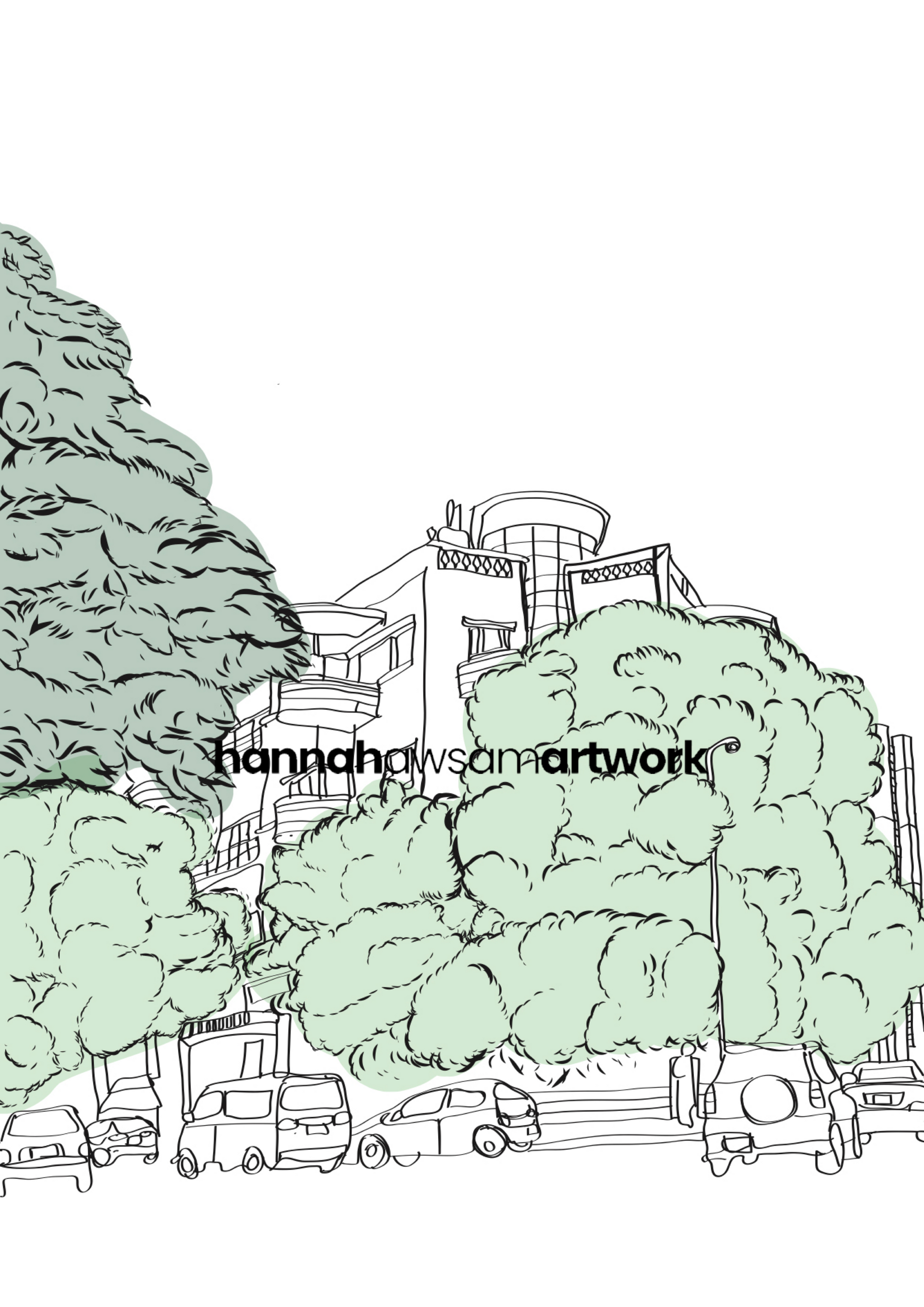 A leafy love letter to Cairo’s calmest corners, lush with foliage and sketchbook soul. You can almost hear the birds and the honking.